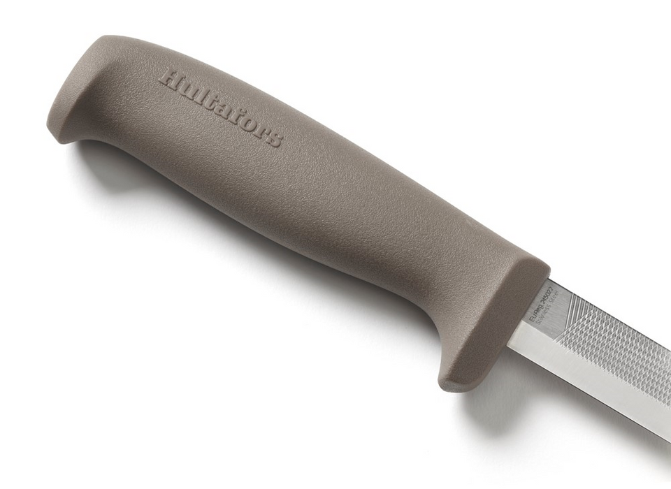 Een loodgietersmes met een vijl, die kan worden gebruikt om bramen te verwijderen. Het heeft een unieke functie om het holster rond een knoop op uw werkkleding te bevestigen, zodat het niet losraakt en het toch makkelijk te verwijderen is. Het lemmet is gemaakt van Japans messenstaal, 2,5 mm roestvast staal, dat is gehard tot 57–59 HRC.
